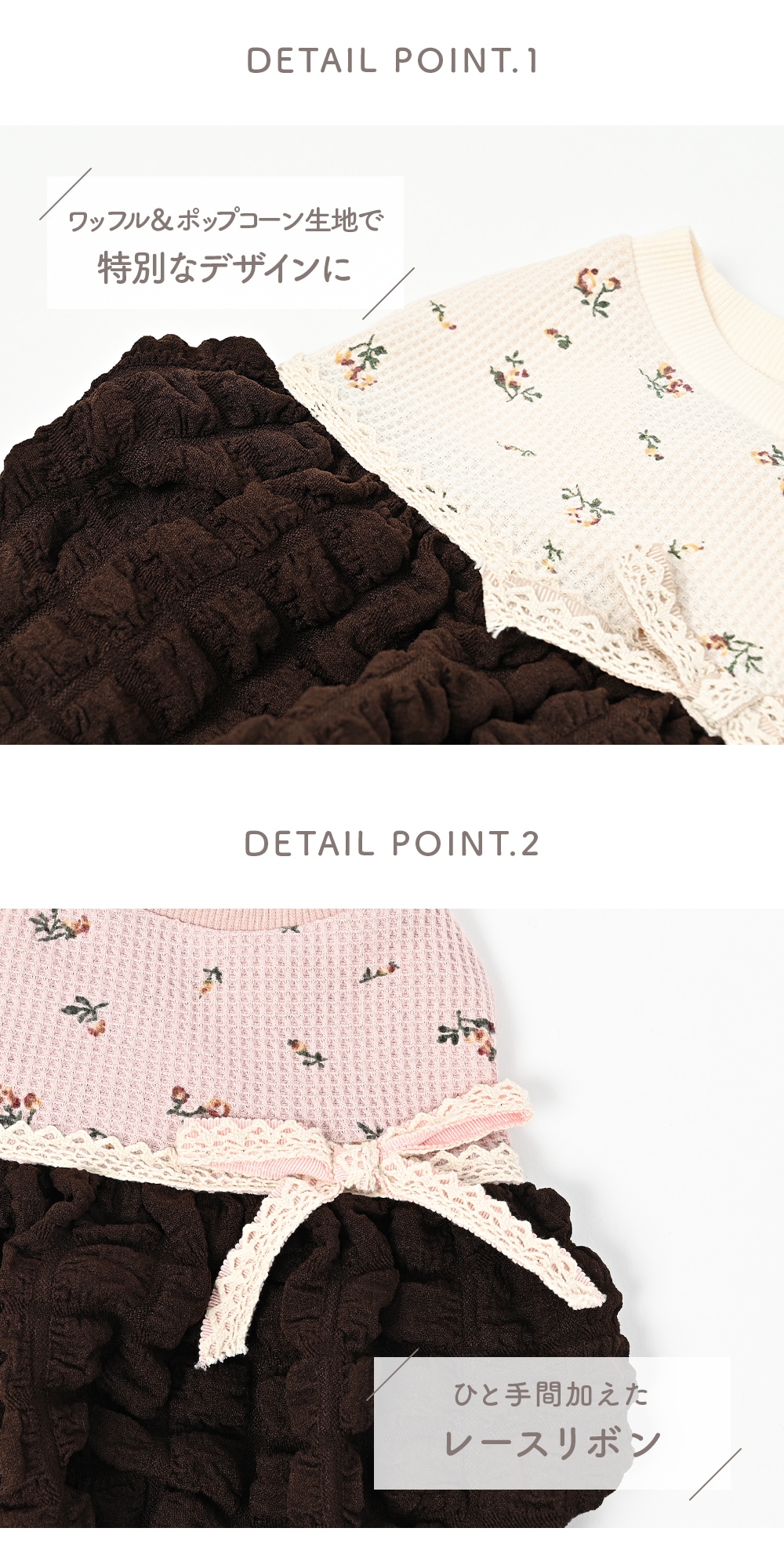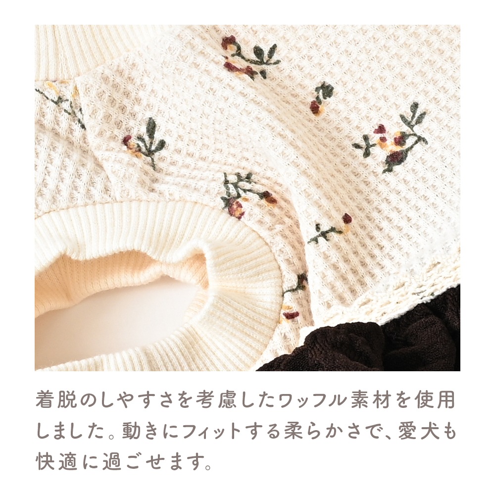 小花柄のワッフル生地はナチュラルな可愛さ。生成りのレースリボンはしっかり縫付けていて、お洗濯も安心仕様です。