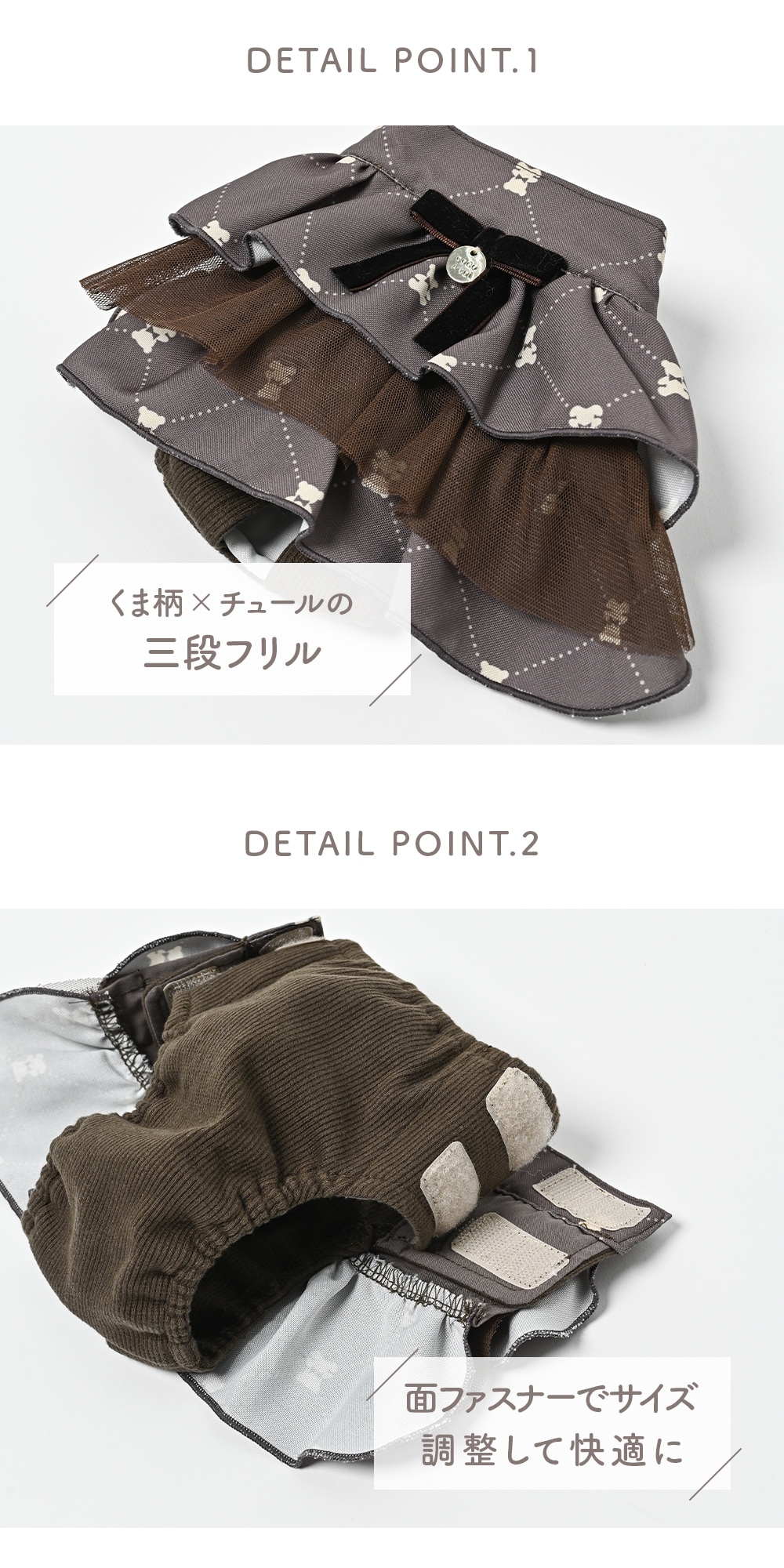 くま柄生地にチュールを重ねたフリルスカートデザイン。ふんわり広がり、可愛らしく装えます。面ファスナーでサイズ調整して快適に