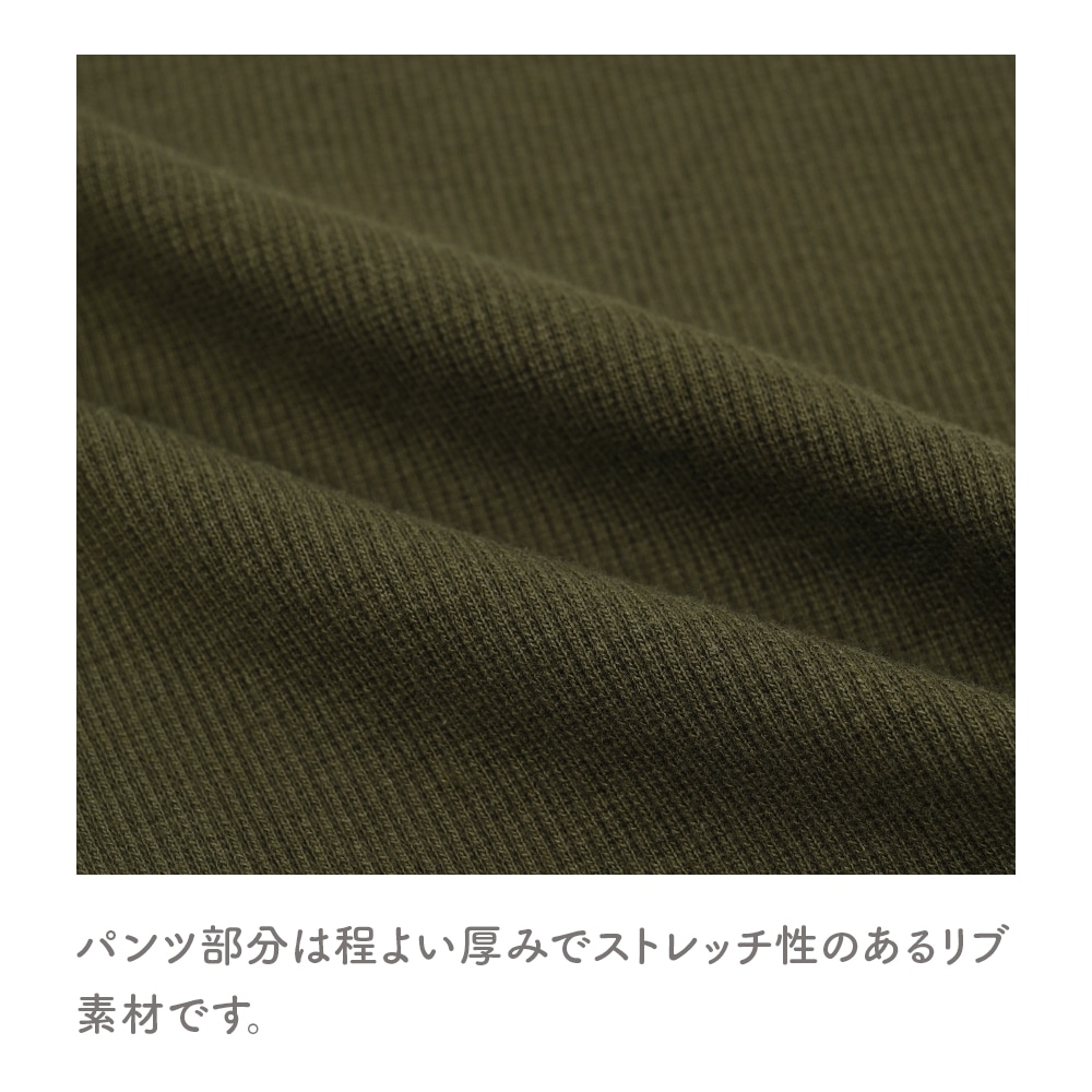 お腹部分はストレッチ性があり着心地の良いコットンのリブ素材。面ファスナーで着脱簡単、体型に合わせてフィット感を調整できます。