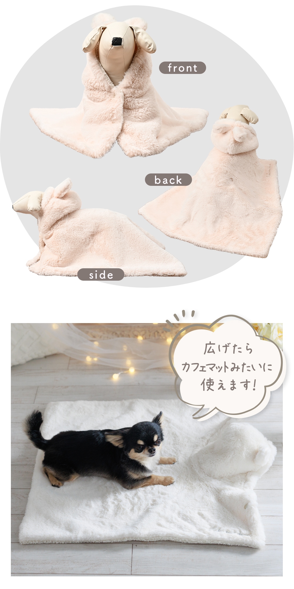 冬のおうち時間やお出かけ、ペットカートで移動時の防寒に。軽くてやさしい着心地です