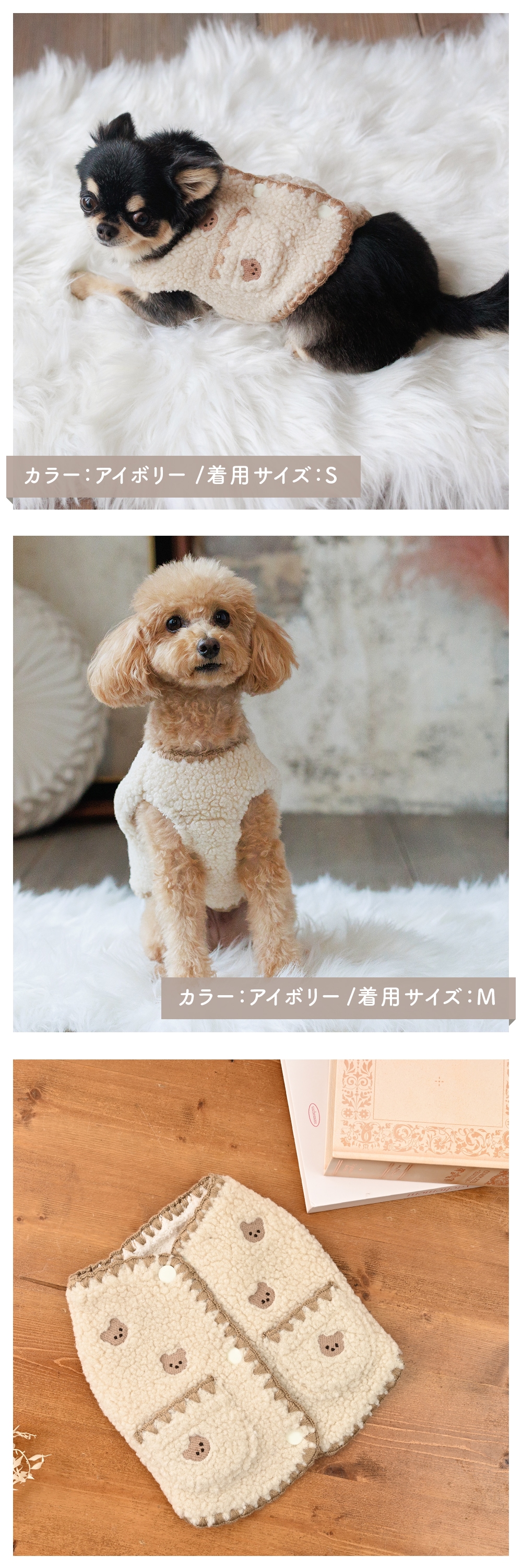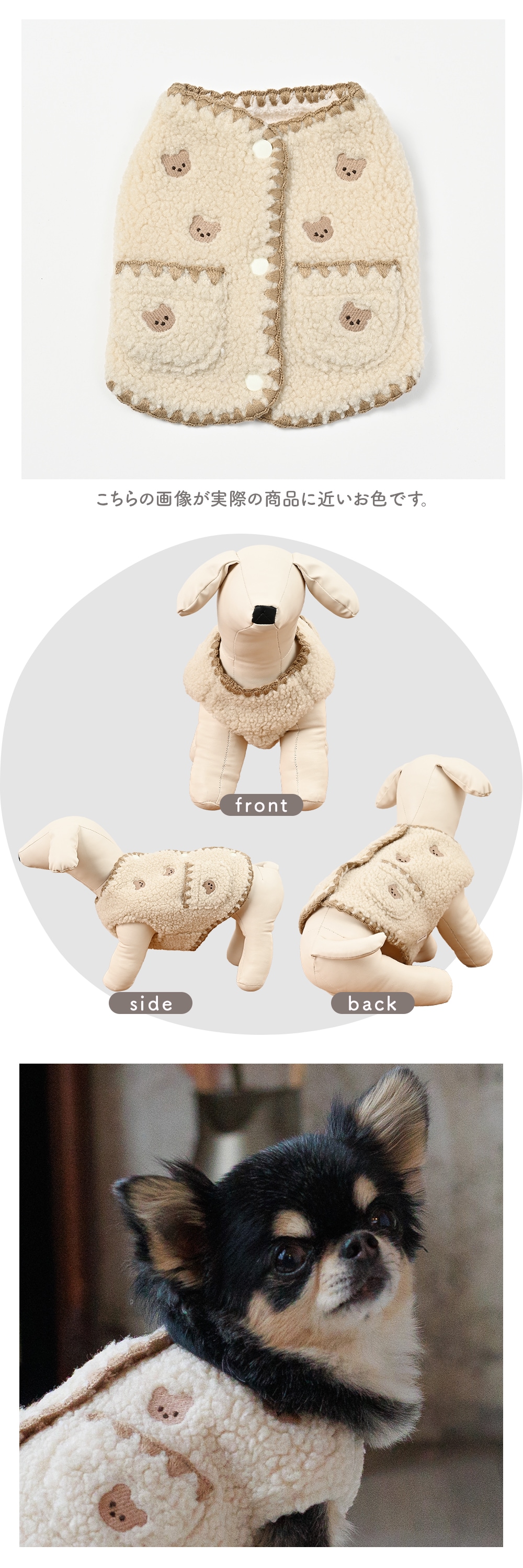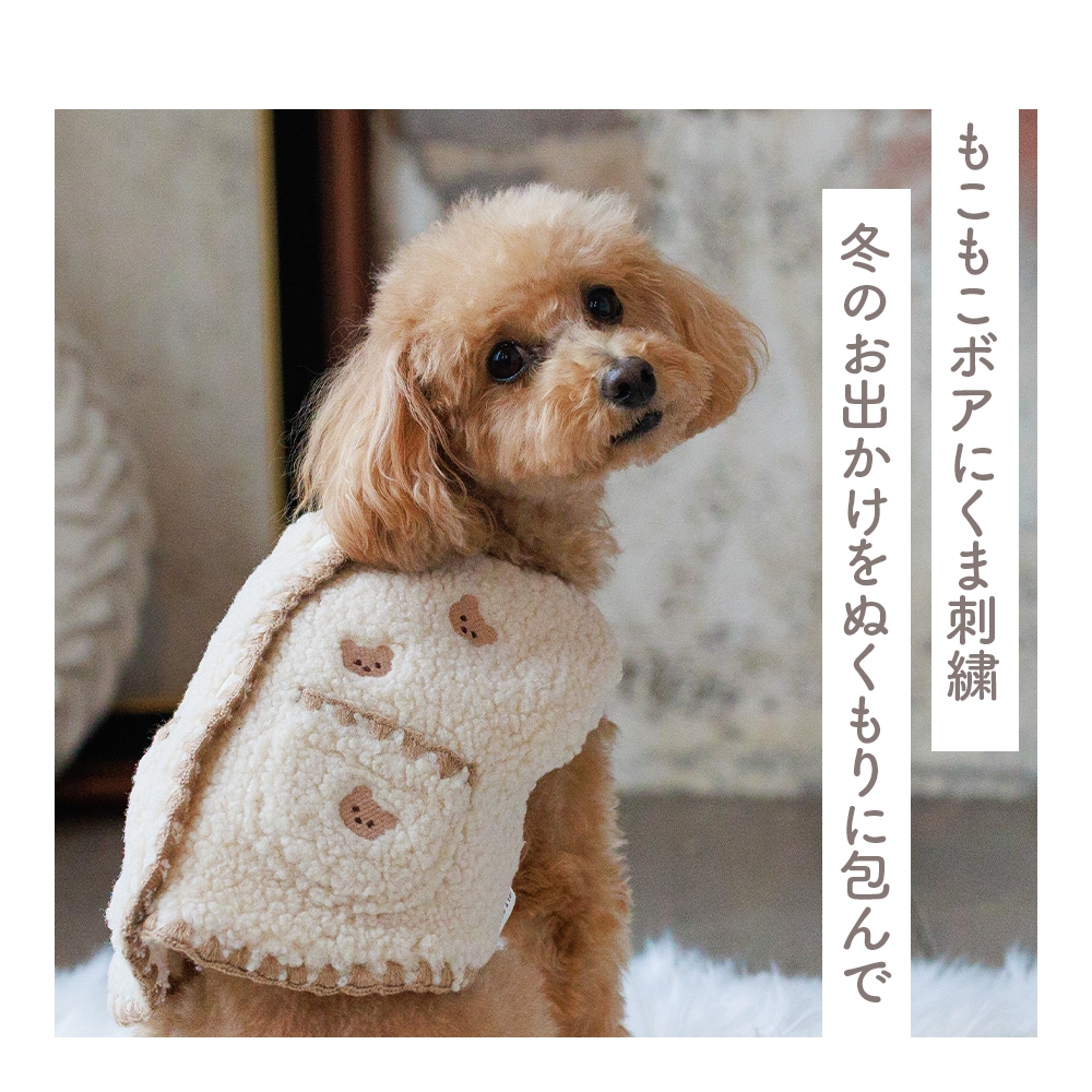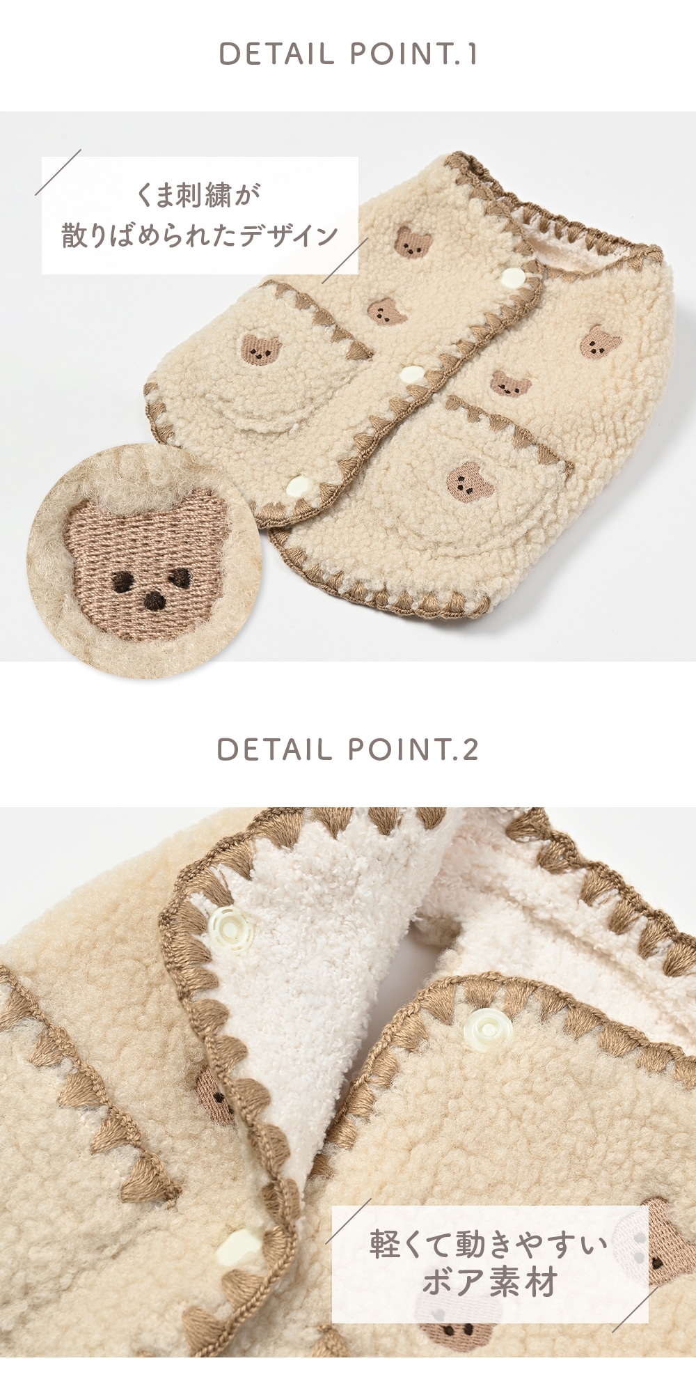背中には小さなくまの刺繍とポケット付き。見るたびに心和む愛らしさです軽くて動きやすいボア素材