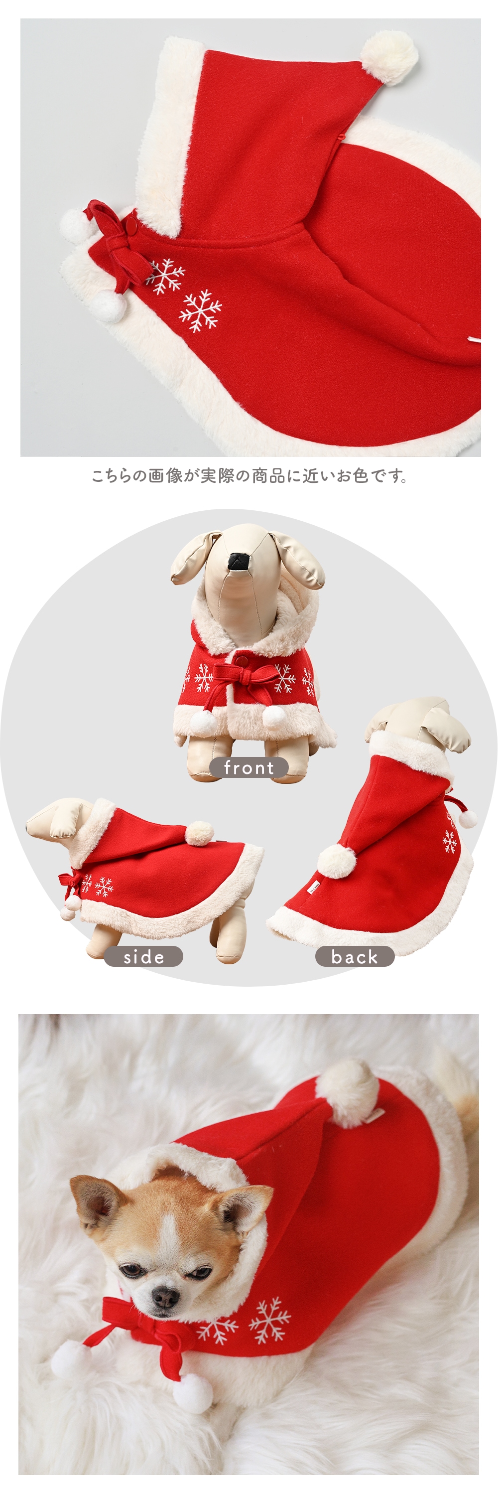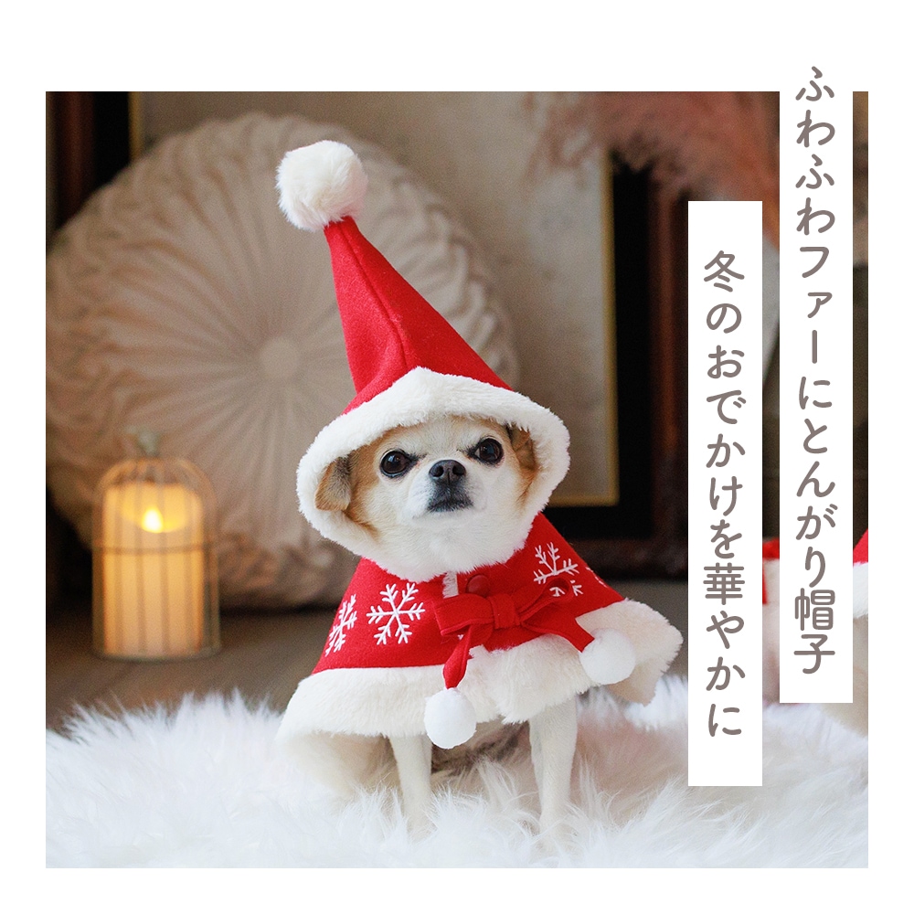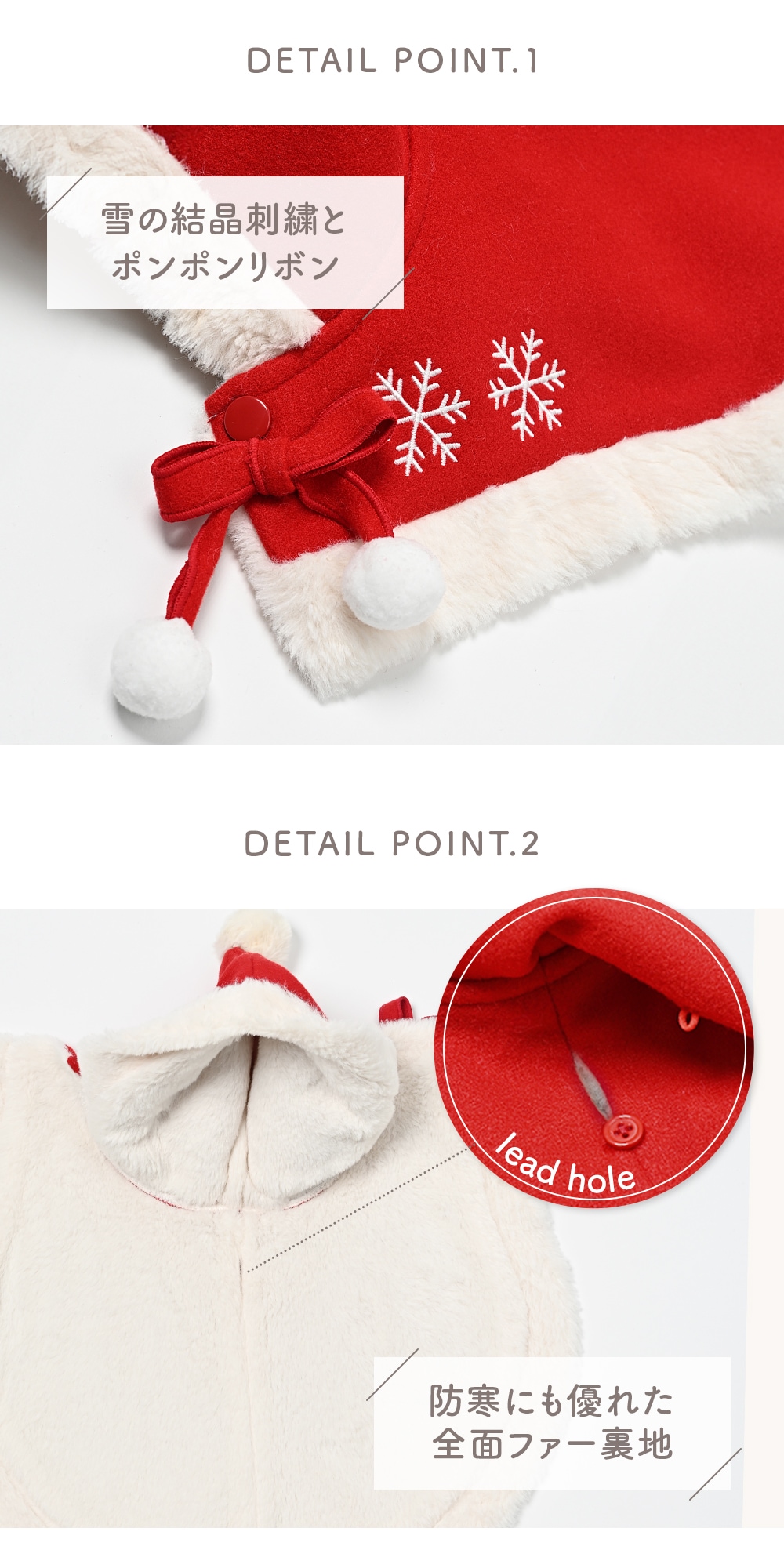 胸元にはポンポン付きのリボンと雪の結晶刺繍。細部まで季節感を演出しています防寒にも優れた全面ファー裏地